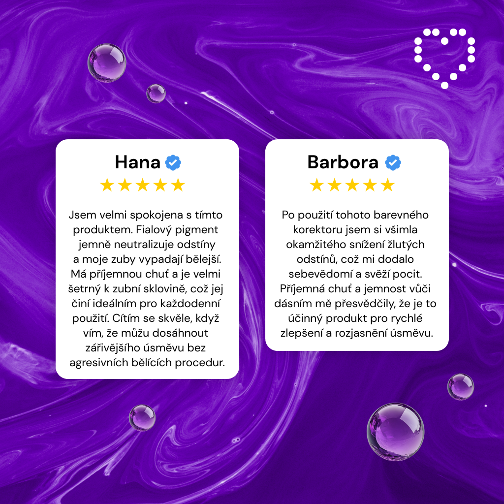 Kombinace dvou ve vodě rozpustných barev korektoru umožňuje odstranit jakýkoli odstín žluté a docílit jasnějšího úsměvu.