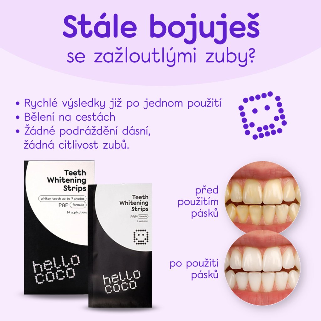 Tradiční bělící pásky používají složení na bázi peroxidu, které může vyvolat citlivost zubů. Hello coco PAP pásky místo toho využívají recepturu založenou na PAP bez citlivosti.