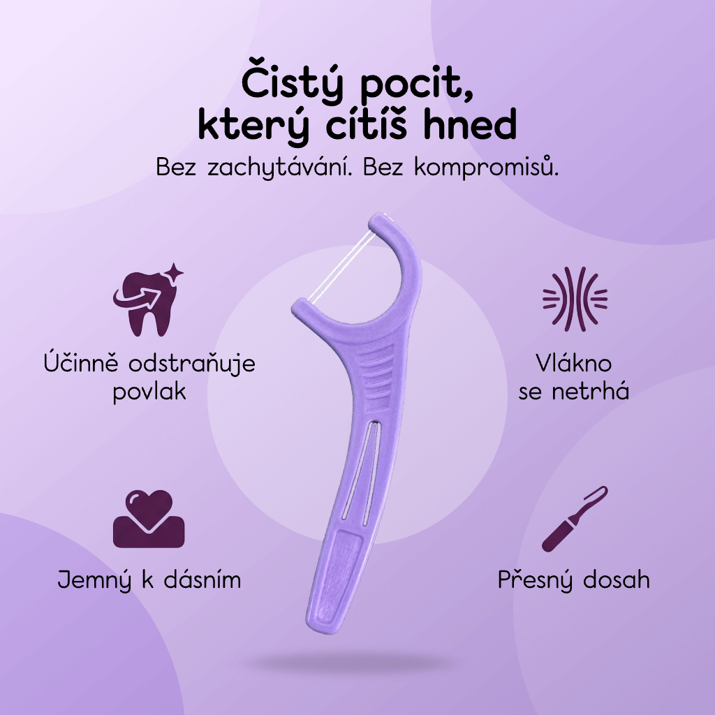 Na místech, kam se kartáček nedostane, rozhoduje pravidelná péče. Dentální párátka s nití účinně odstraňují zbytky jídla i povlak mezi zuby a pomáhají udržovat zdravé dásně a svěží dech každý den.