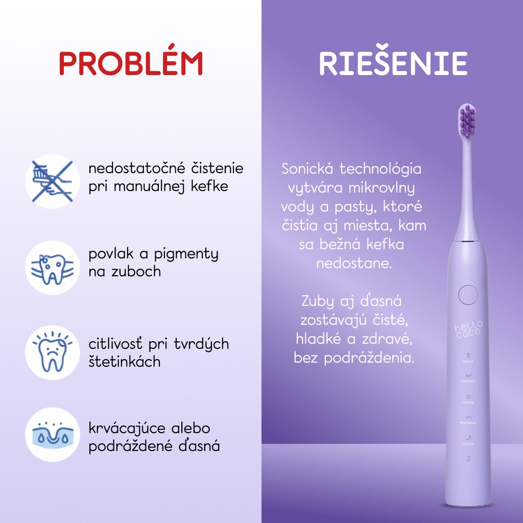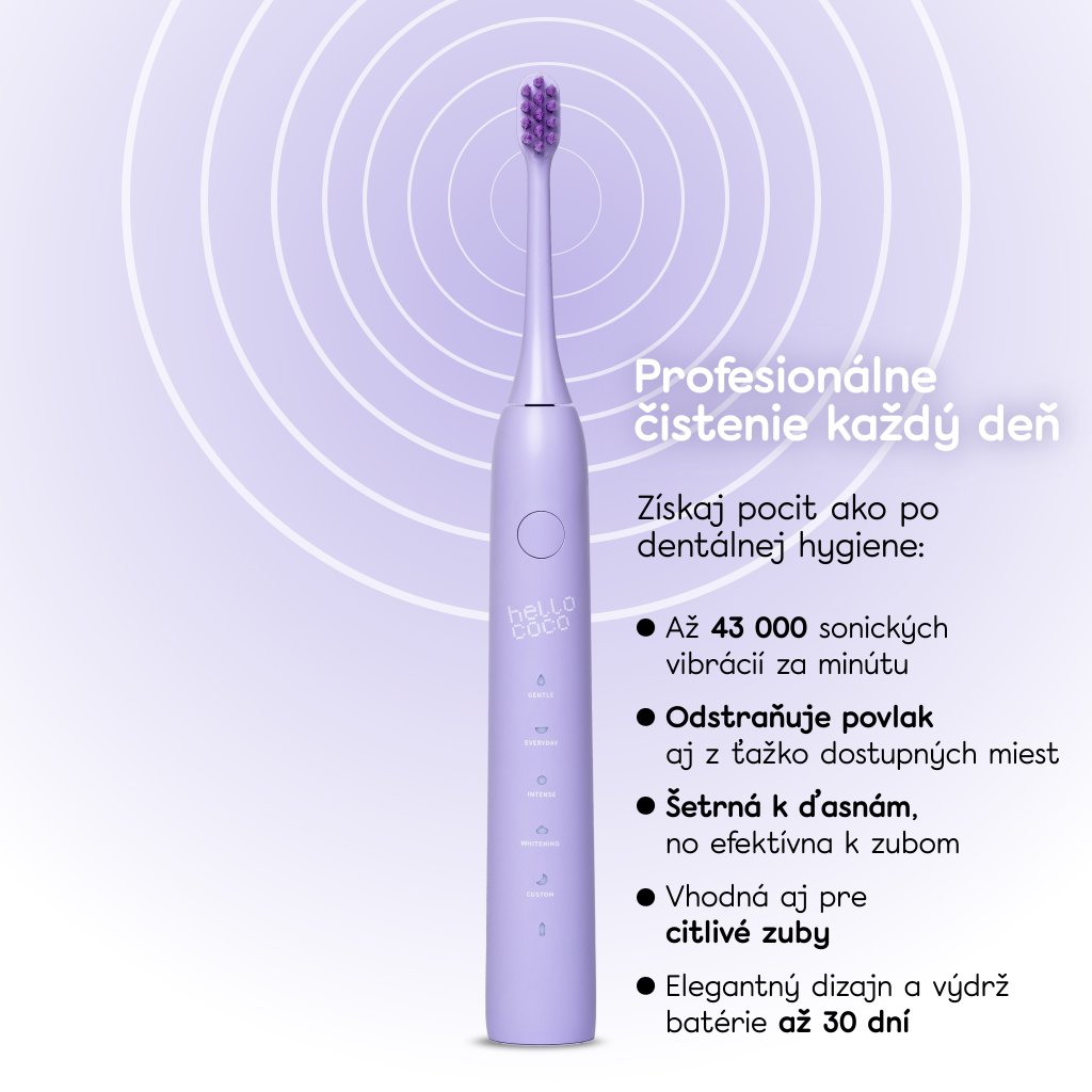 Elektrický zubní kartáček hello coco využívá sonickou technologii s revoluční frekvencí až 43 000 vibrací za minutu, které jemně odstraňují nečistoty, pomáhají při prevenci zubního kamene a odstraňují povrchový plak. Speciální režimy jemně stimulují a čistí dásně, čímž poskytují účinné a individuální čištění.