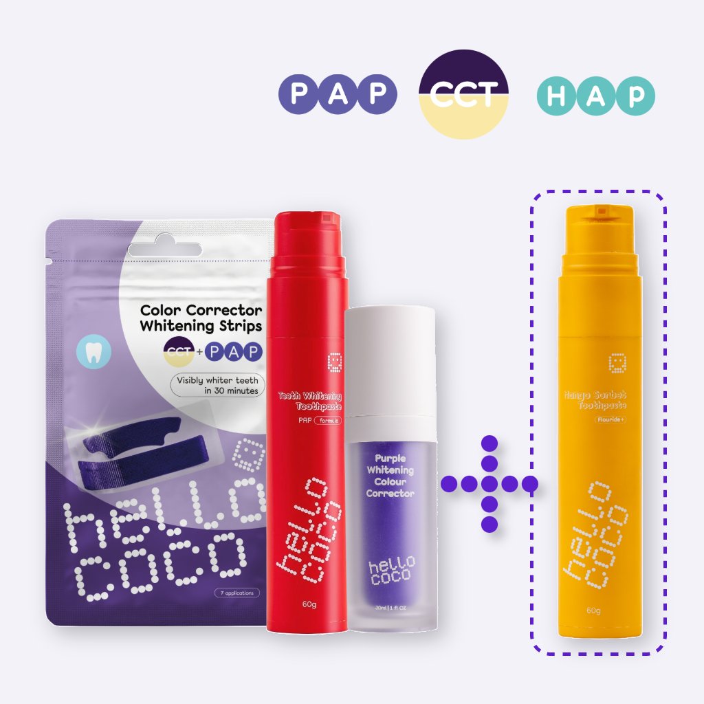 Korektorová pasta funguje na rozjasnění zubů pomocí technologie korekce barev, zatímco naše CCT pásky mají okamžitý optický efekt a viditelné bělení díky technologii PAP a představují náš nejpohodlnější způsob bělení. Každodenní bělící zubní pasta navíc odstraní jemné skvrny a dodá vašim zubům celkově bělejší úsměv.