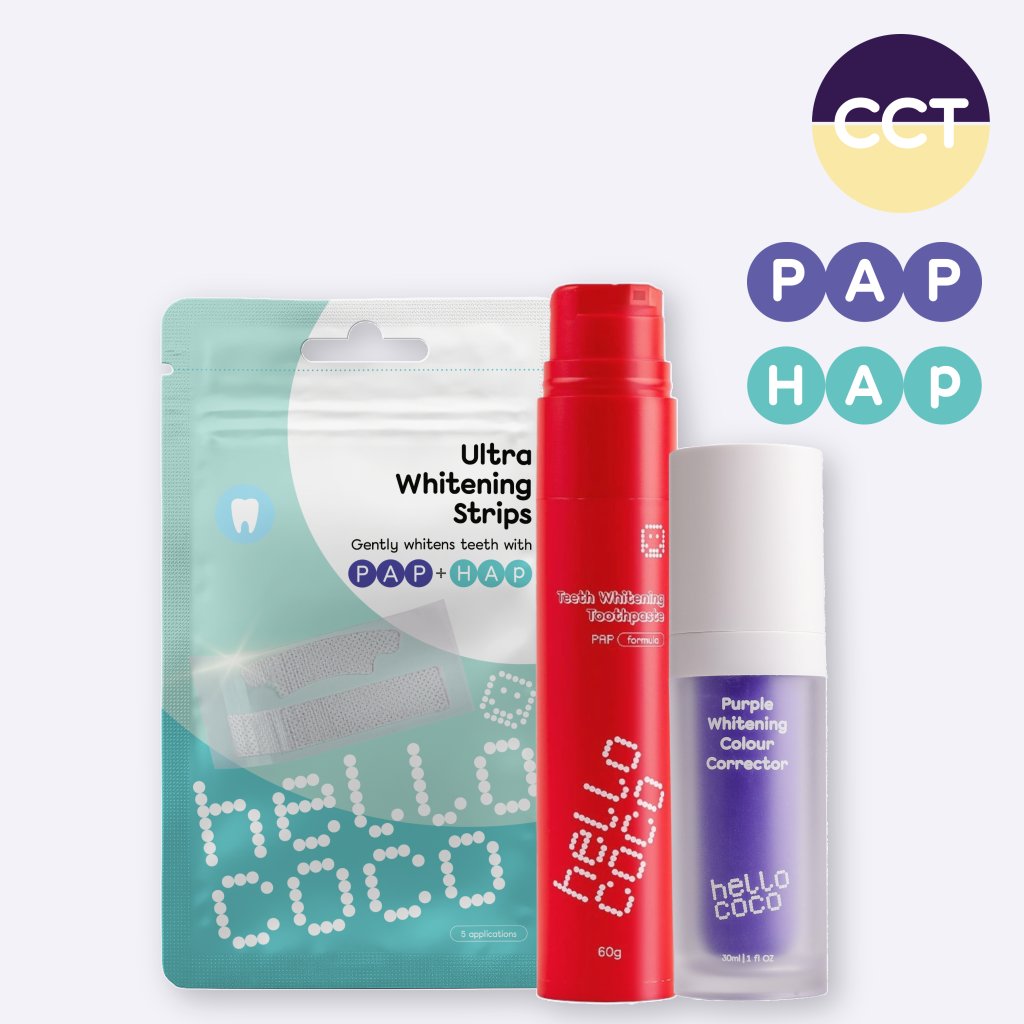 Korektorová pasta rozjasňuje zuby pomocí technologie korekce barev, zatímco naše bělící pásky s nejvyšší koncentrací PAP pro ultra účinné bělení představují náš nejpohodlnější způsob bělení. Každodenní bělící zubní pasta navíc odstraní jemné skvrny a dodá vašim zubům celkově bělejší úsměv.