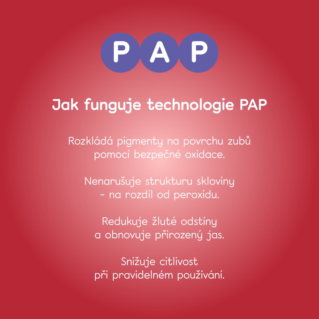 Zubní pasta PAP bezpečně bělí zuby a chrání je před demineralizací skloviny.