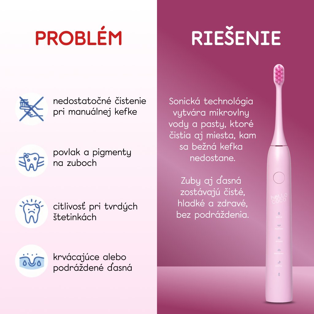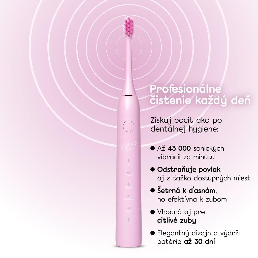 Elektrický zubní kartáček hello coco využívá sonickou technologii s revoluční frekvencí až 43 000 vibrací za minutu, které jemně odstraňují nečistoty, pomáhají při prevenci zubního kamene a odstraňují povrchový plak. Speciální režimy jemně stimulují a čistí dásně, čímž poskytují účinné a individuální čištění.